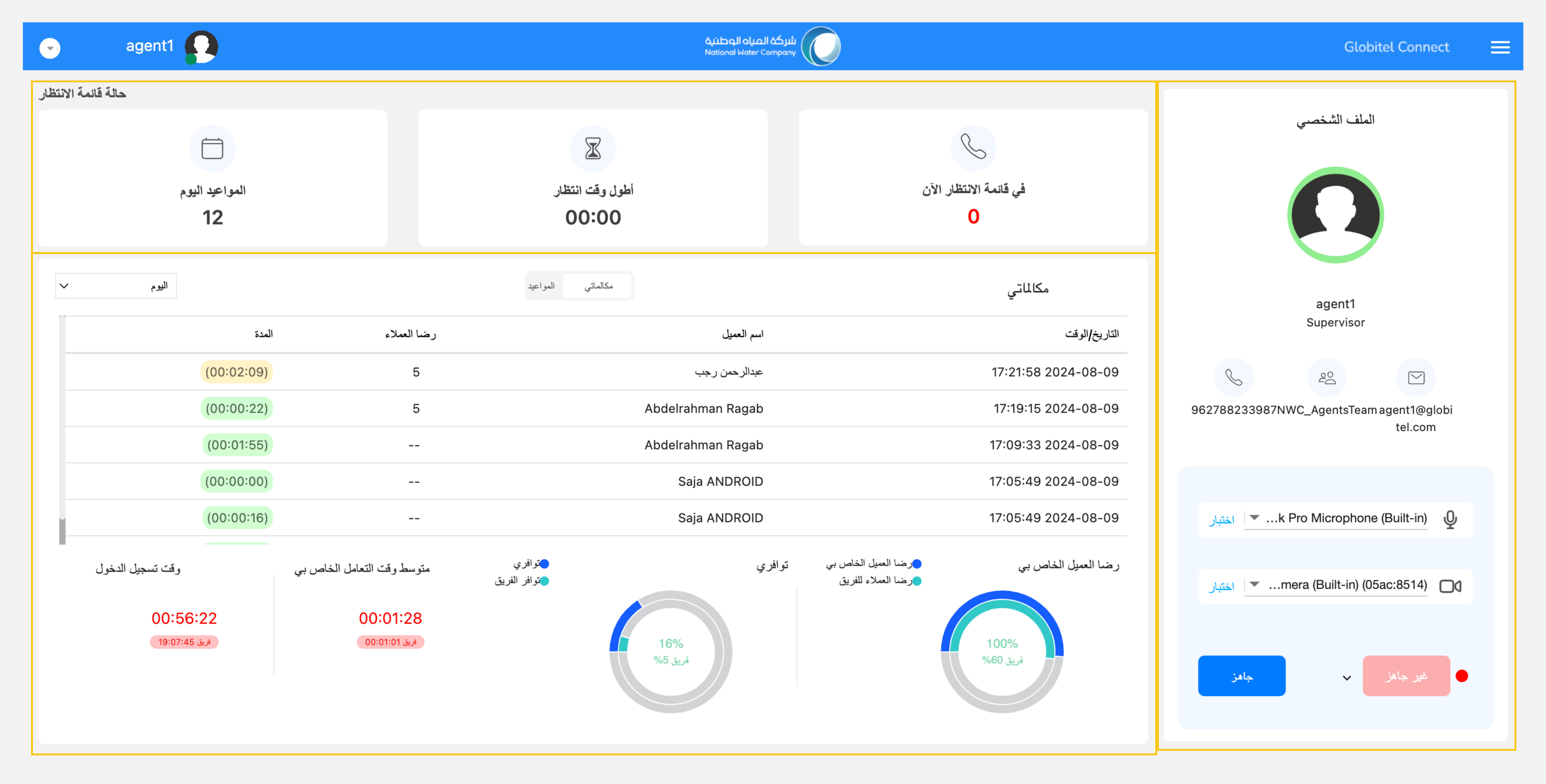 هذه هي الشاشة الأولى والإفتراضية التي ستصل إليها بعد تسجيل الدخول ومشاركة شاشتك. إنها صفحة مساحة العمل الخاصة بك بحيث توفر تفاصيل شاملة حول تفاعلات العملاء وأدائك الخاص والجاهزية لإستقبال تفاعلات جديدة من العملاء. هذا مفيد للغاية لإعطائك نظرة على ما يحدث حولك.