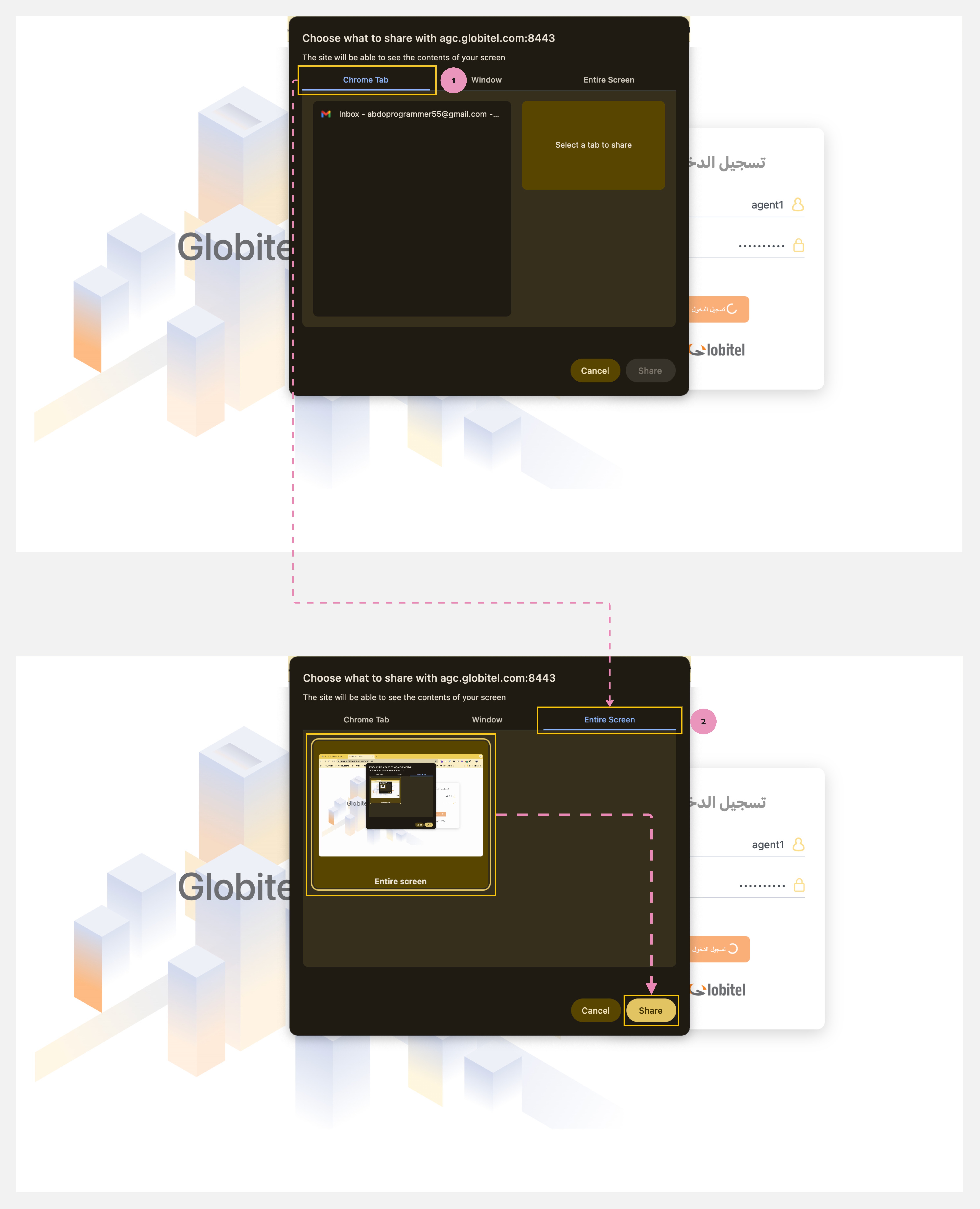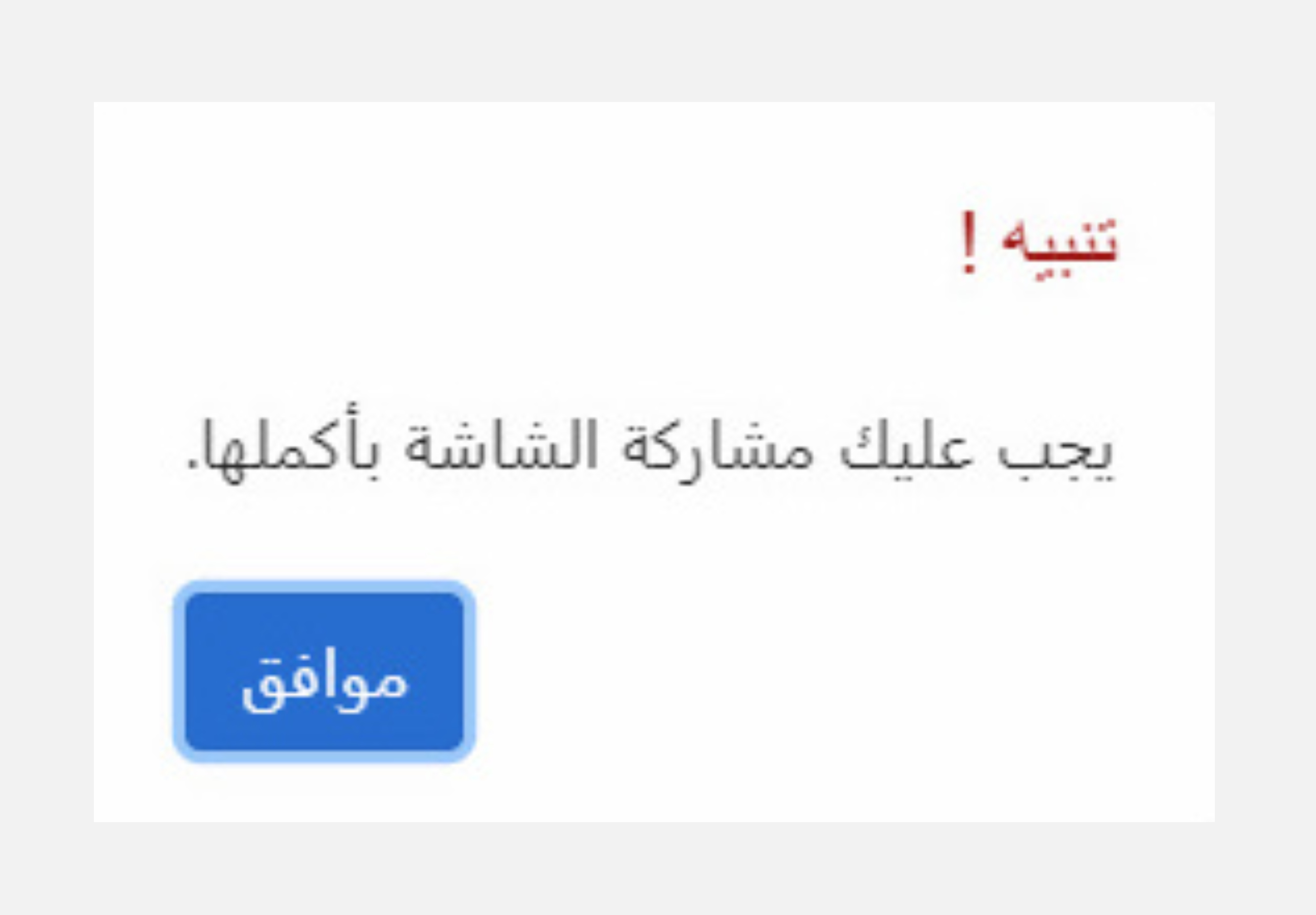 هذه خطوة ضرورية بالنسبة لك لبدء استخدام النظام. ستحتاج إلى مشاركة شاشة متصفحك بالكامل مع النظام بحيث يسجل أنشطة شاشتك لغرض مراقبة الجودة.