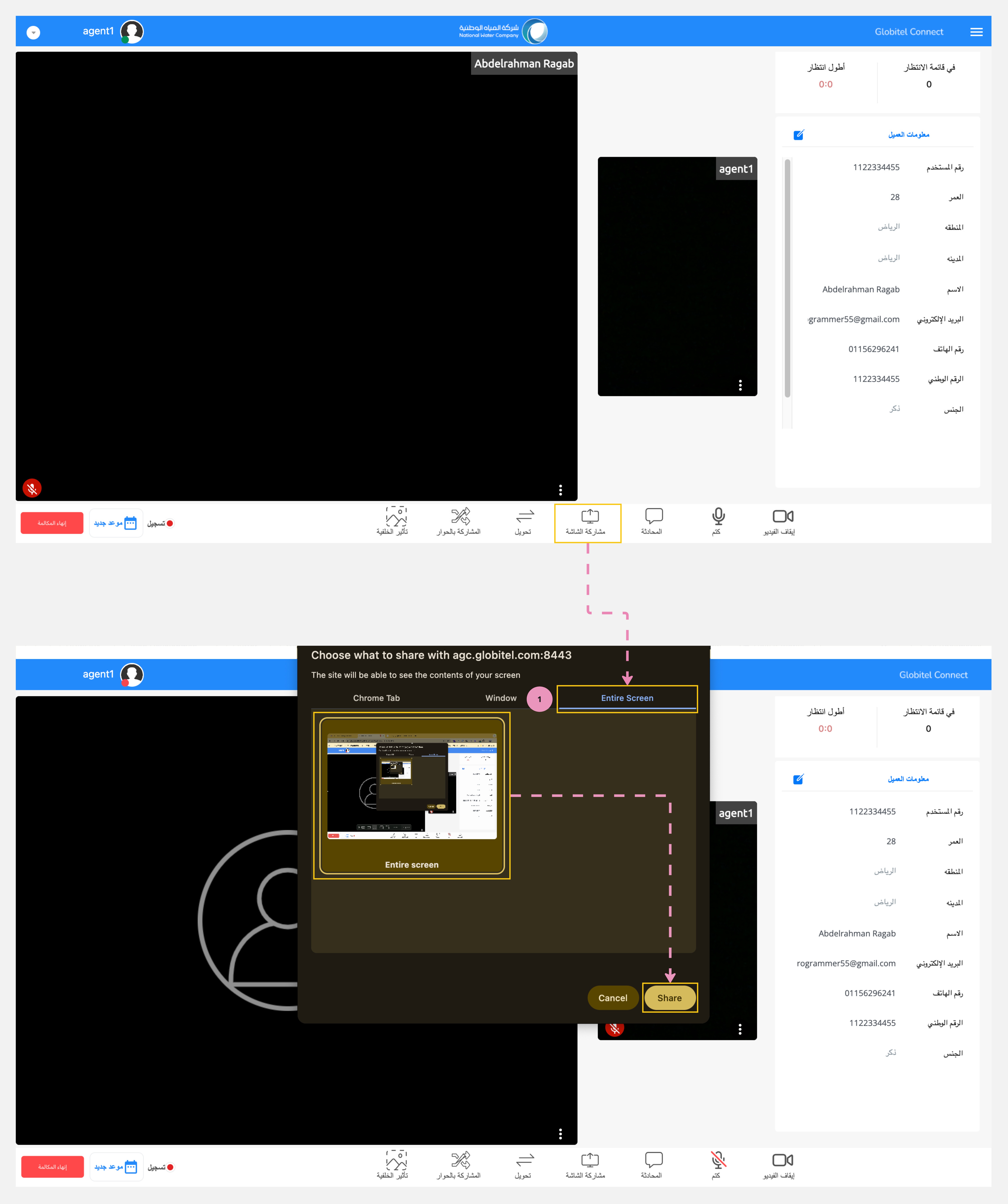 أثناء تفاعلات العملاء، يمكنك مشاركة شاشتك مع العميل لتقديم المعلومات الضرورية أو شرح كيفية استخدام الخدمات التي تتطلب مشاركة الشاشة.