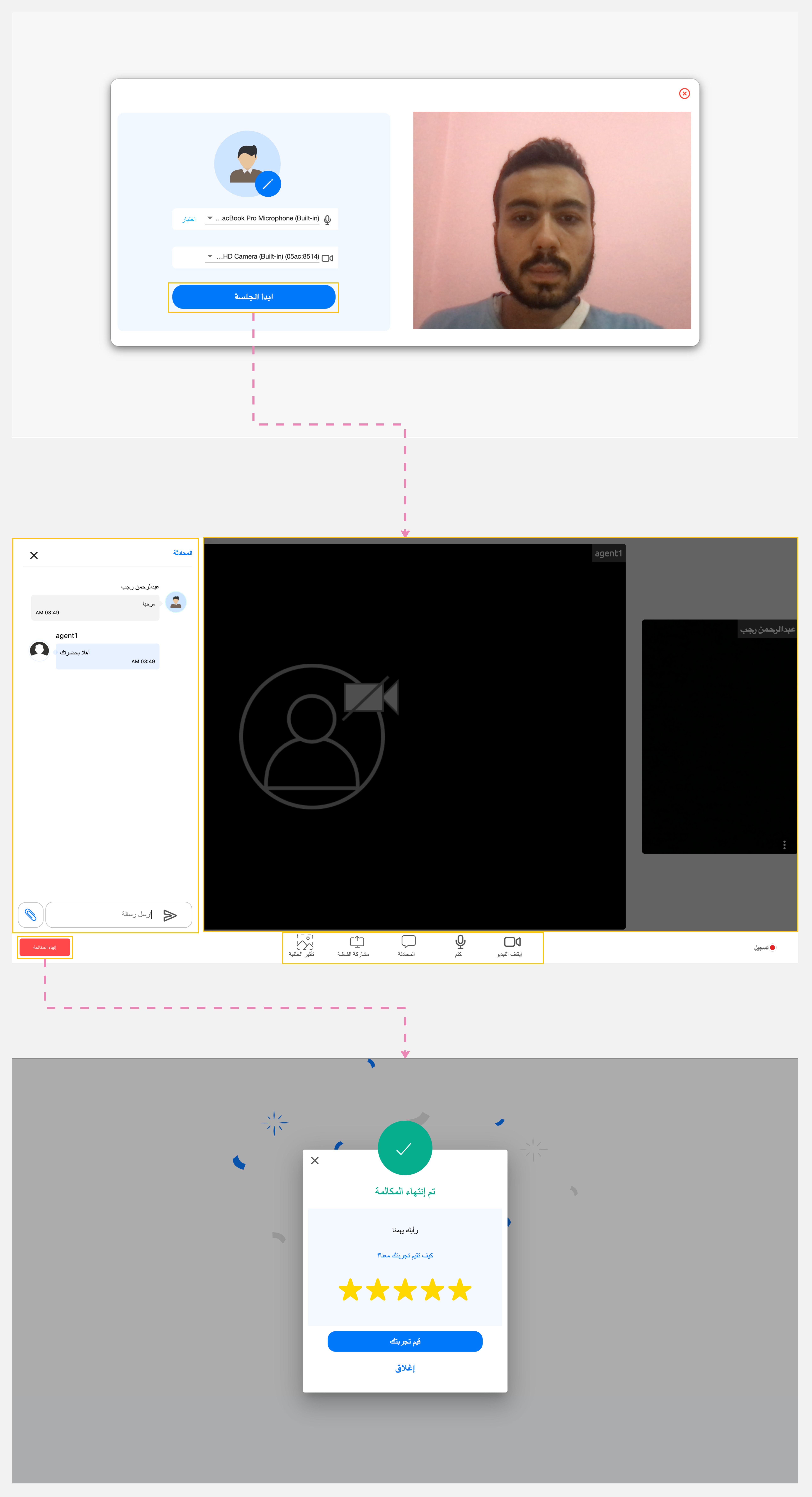 تسمح لك هذه الميزة باختبار الكاميرا والميكروفون المتصلين بالحاسوب والتأكد من أنهم يعملان بالشكل الصحيح قبل التفاعل مع العملاء.