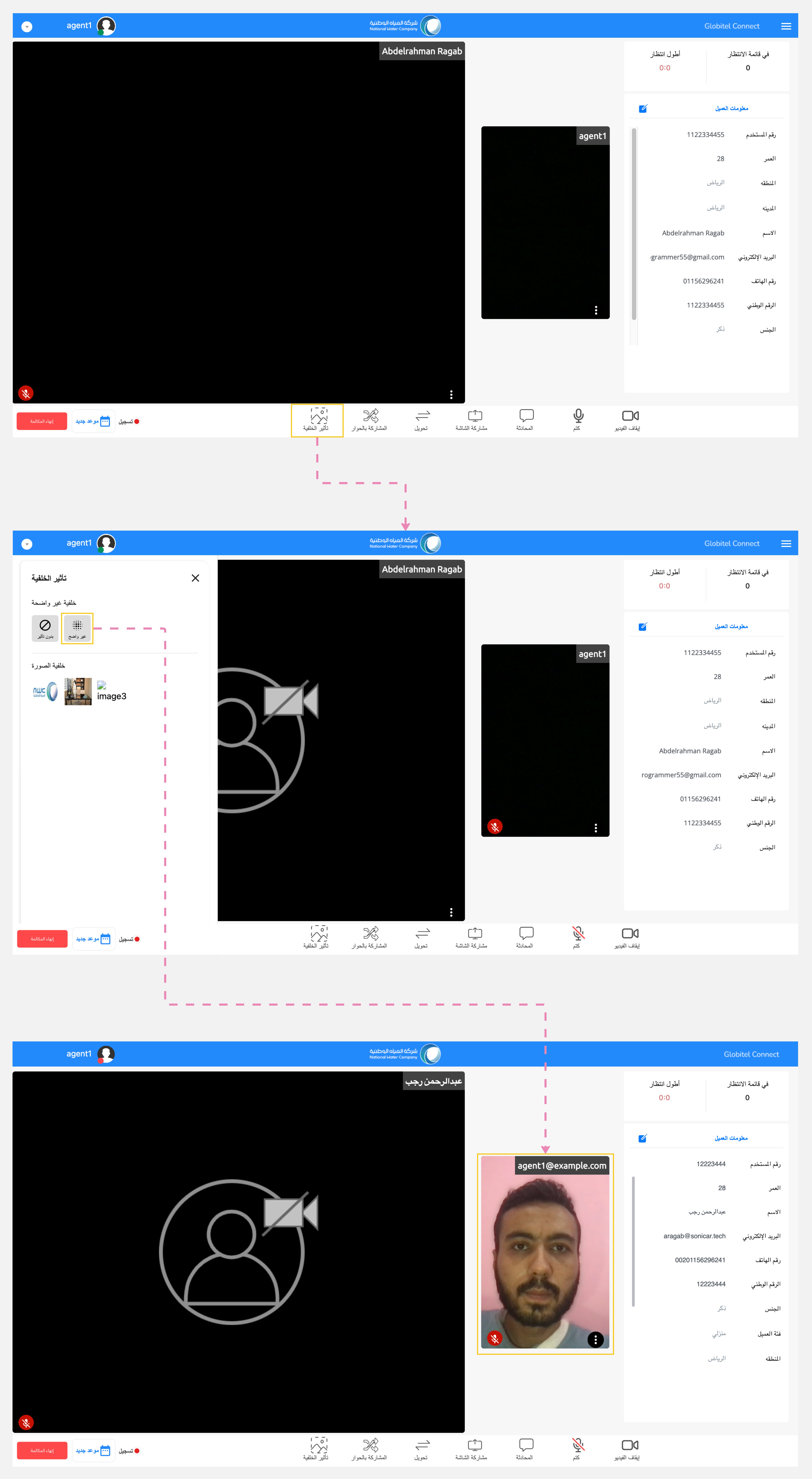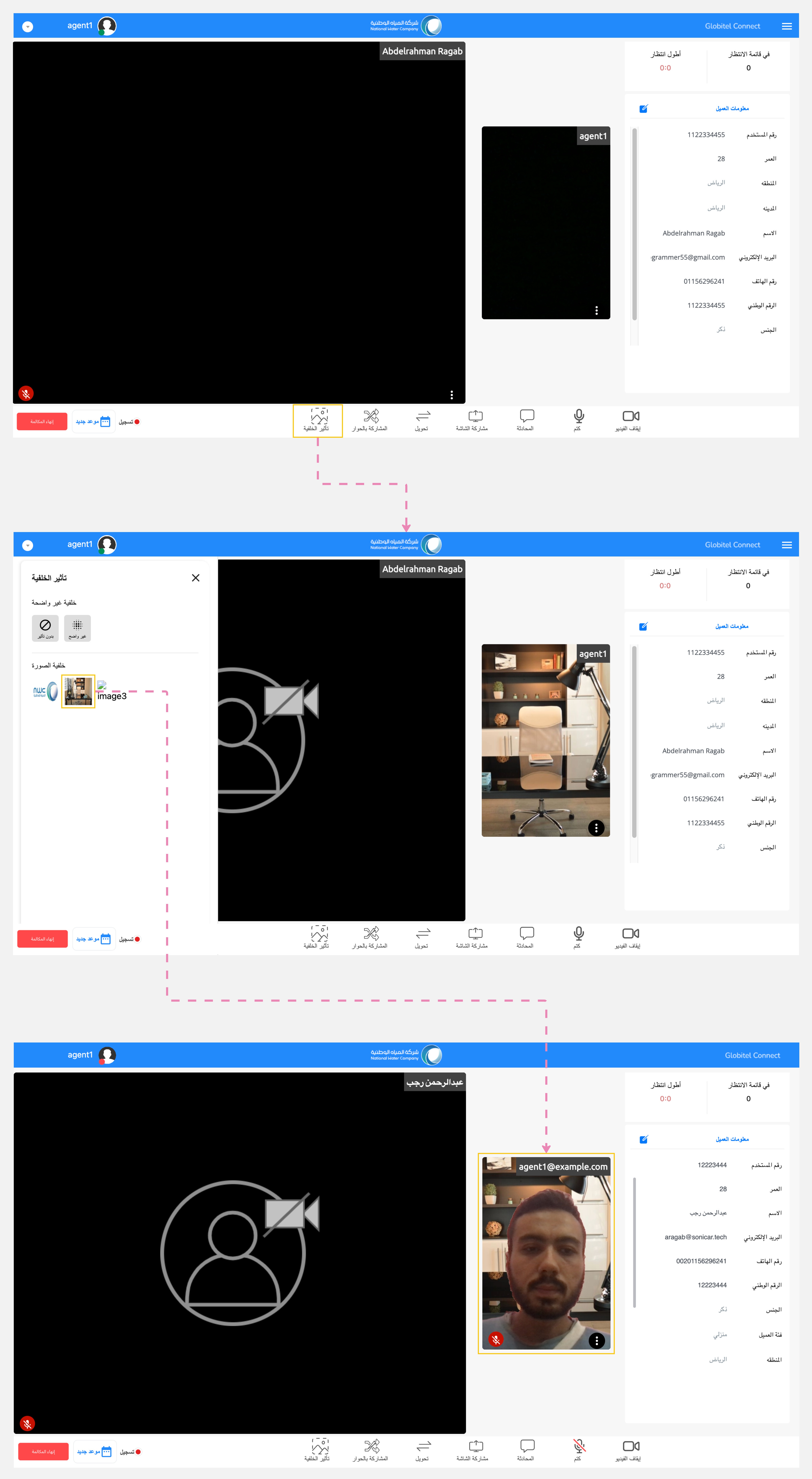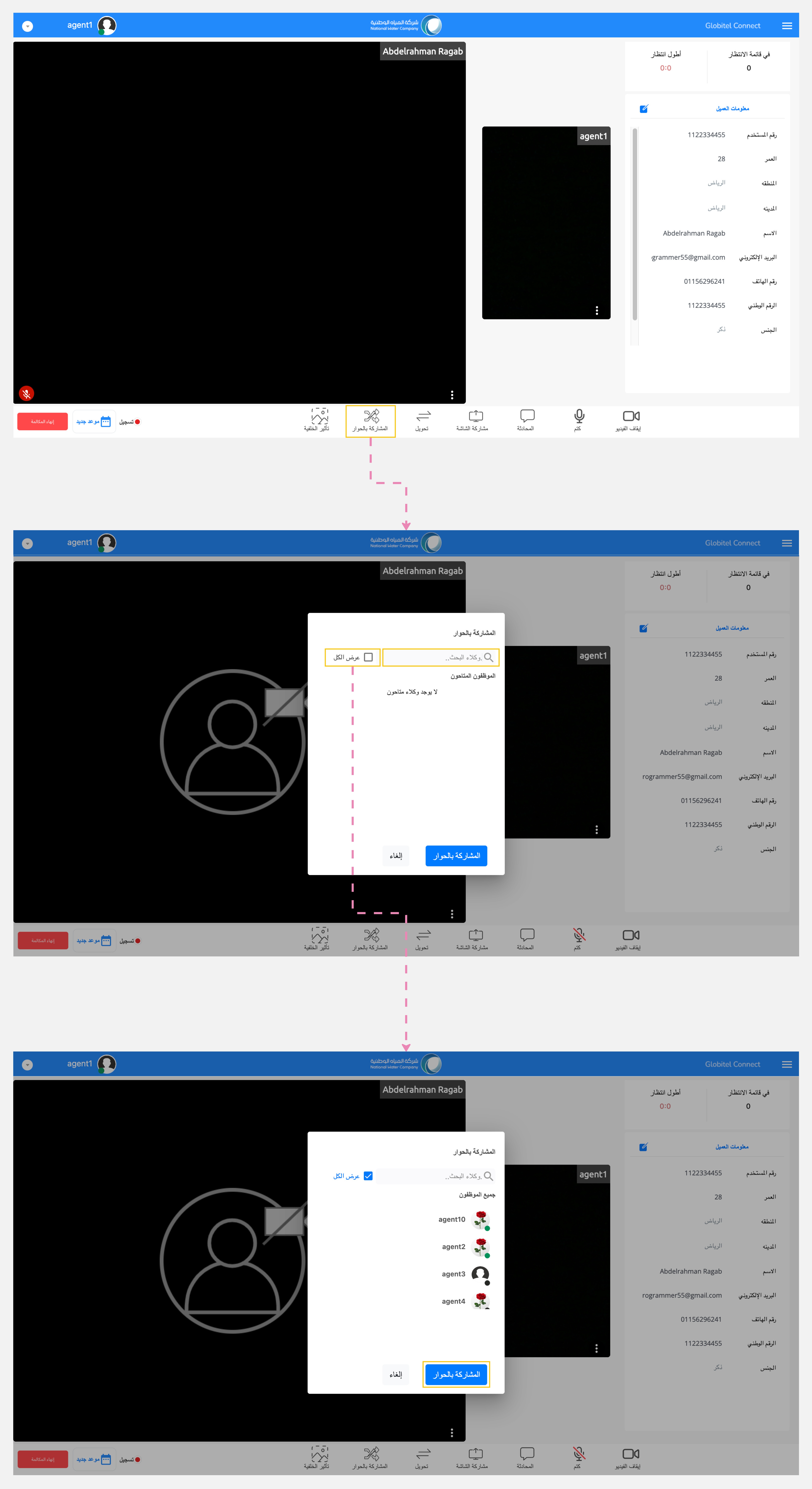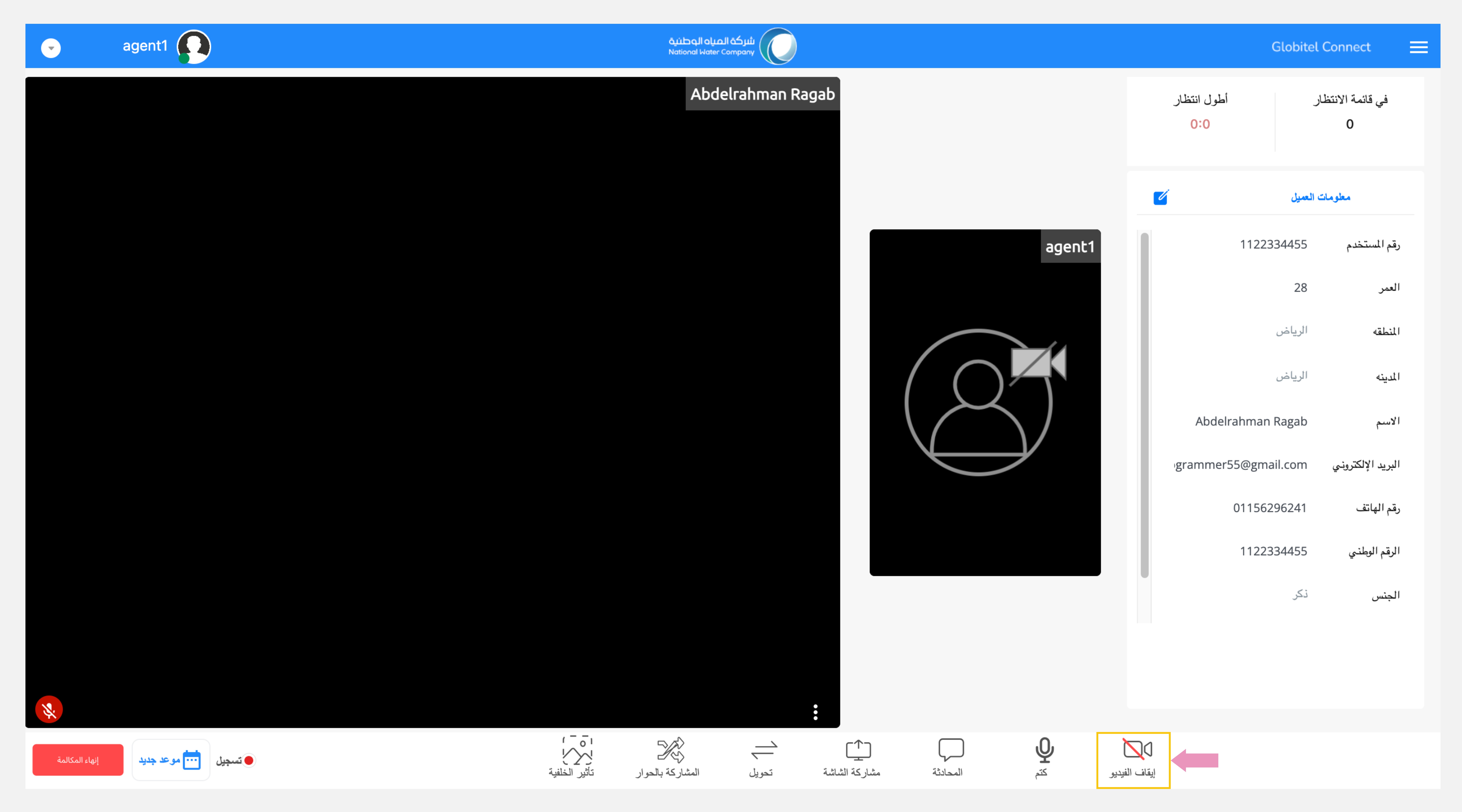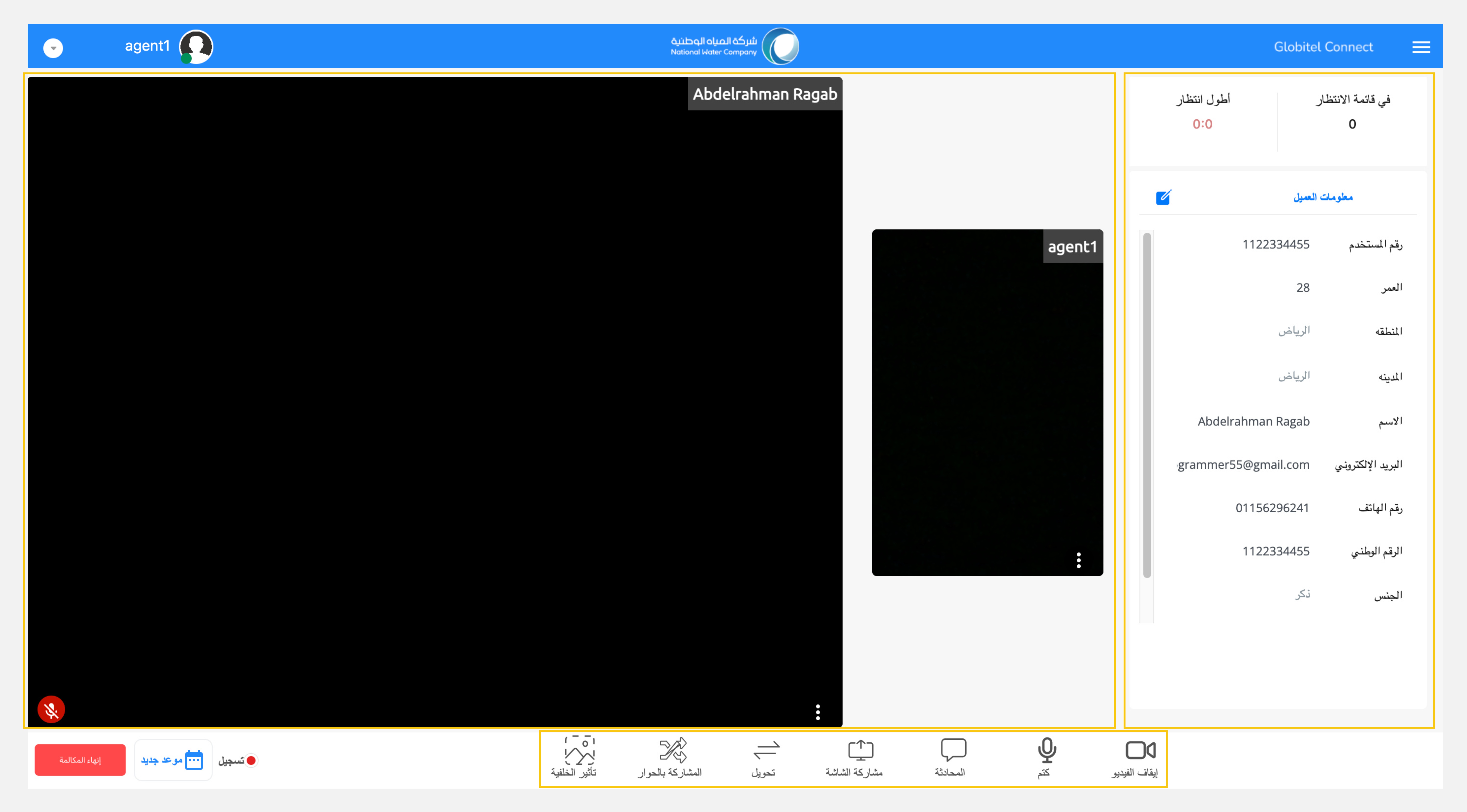 يوفر لك نظام جلوبيتل كونكت مجموعة شاملة من الميزات لإدارة المكالمة مع العميل أثناء التفاعل، بما في ذلك مشاركة الملفات مع العميل، وتغيير خلفية الكاميرا أثناء التفاعل، والدردشة مع العميل، وتحويل المكالمة إلى موظف خدمة عملاء آخر وإنشاء اجتماع جماعي مع المشرف، ومشاركة شاشتك مع العميل، وغير ذلك الكثير.