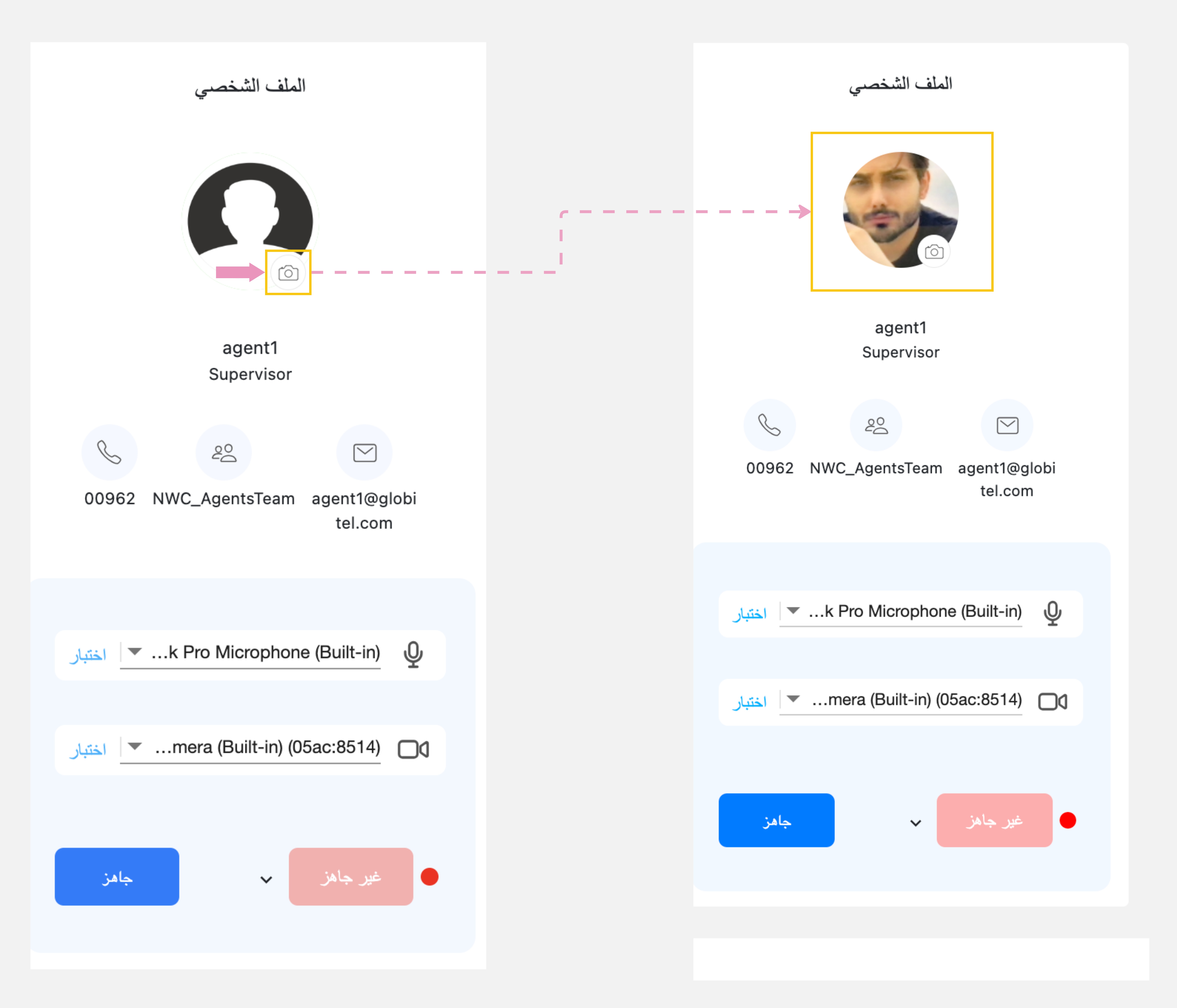 - صورة الملف الشخصي: صورتك المعروضة أثناء مكالمات العملاء.