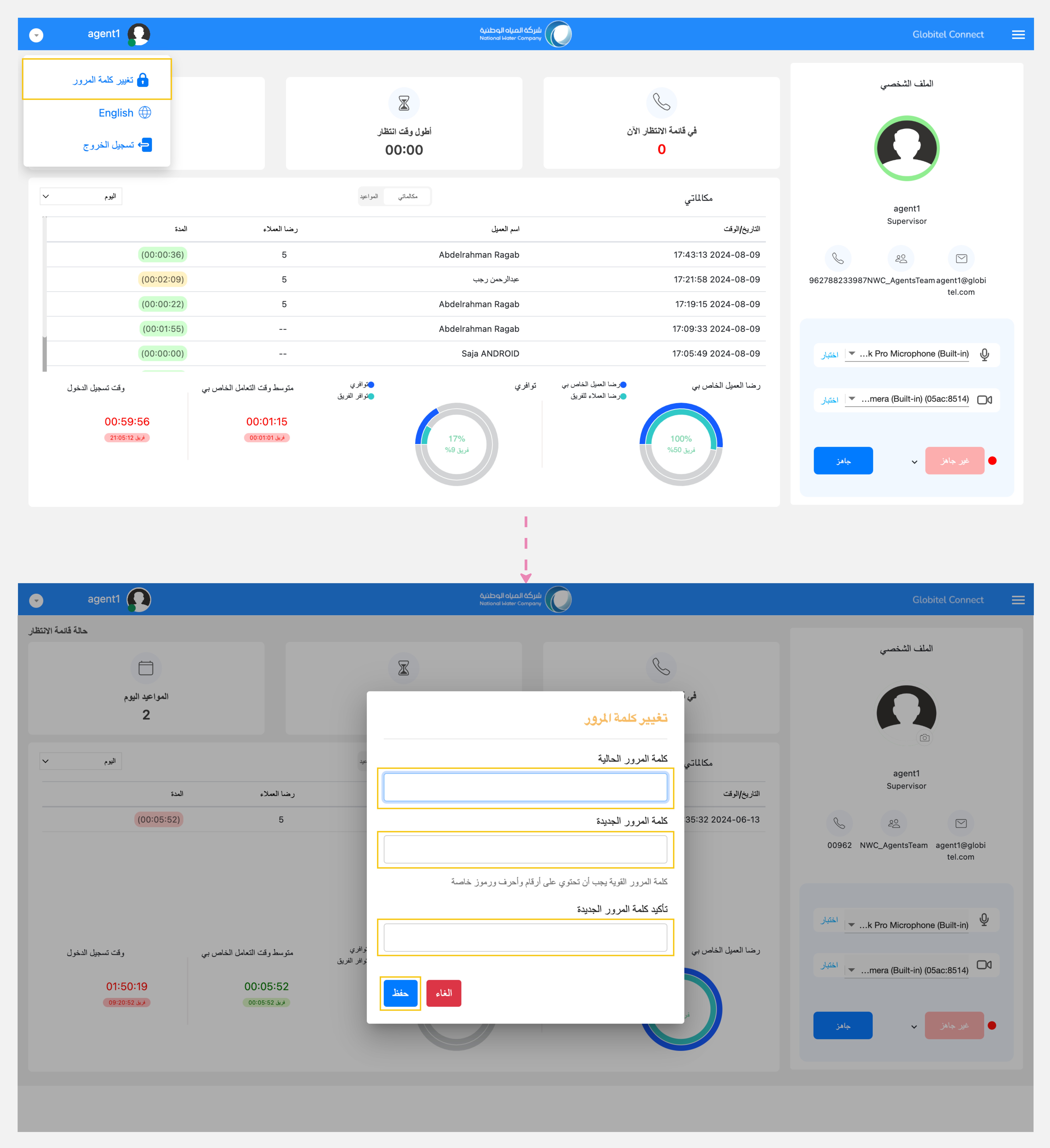 | الحالة الحالية | يُظهر هذا حالة موظف خدمة العملاء في الوقت الفعلي والوقت، مع الإشارة إلى ما إذا كان متصلاً بالإنترنت أو جاهزًا للمكالمات أو في مكالمة حاليًا أو غير متصل. |