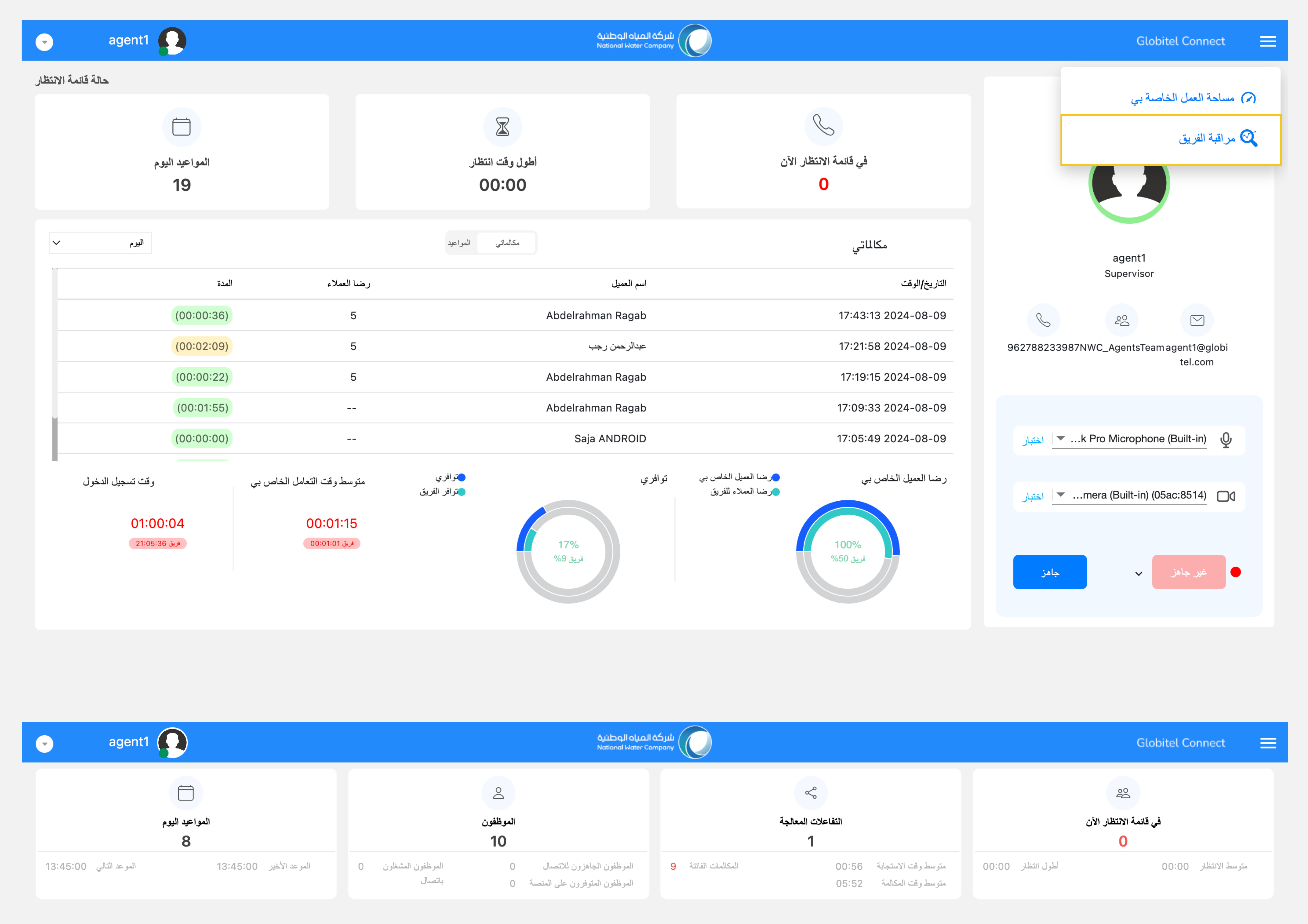 - حالة الفريق: تقدم لك معرفة حالة تواجد الفريق وإحصائيات حول رضا العملاء وعدد المكالمات التي تمت معالجتها لكل موظف.