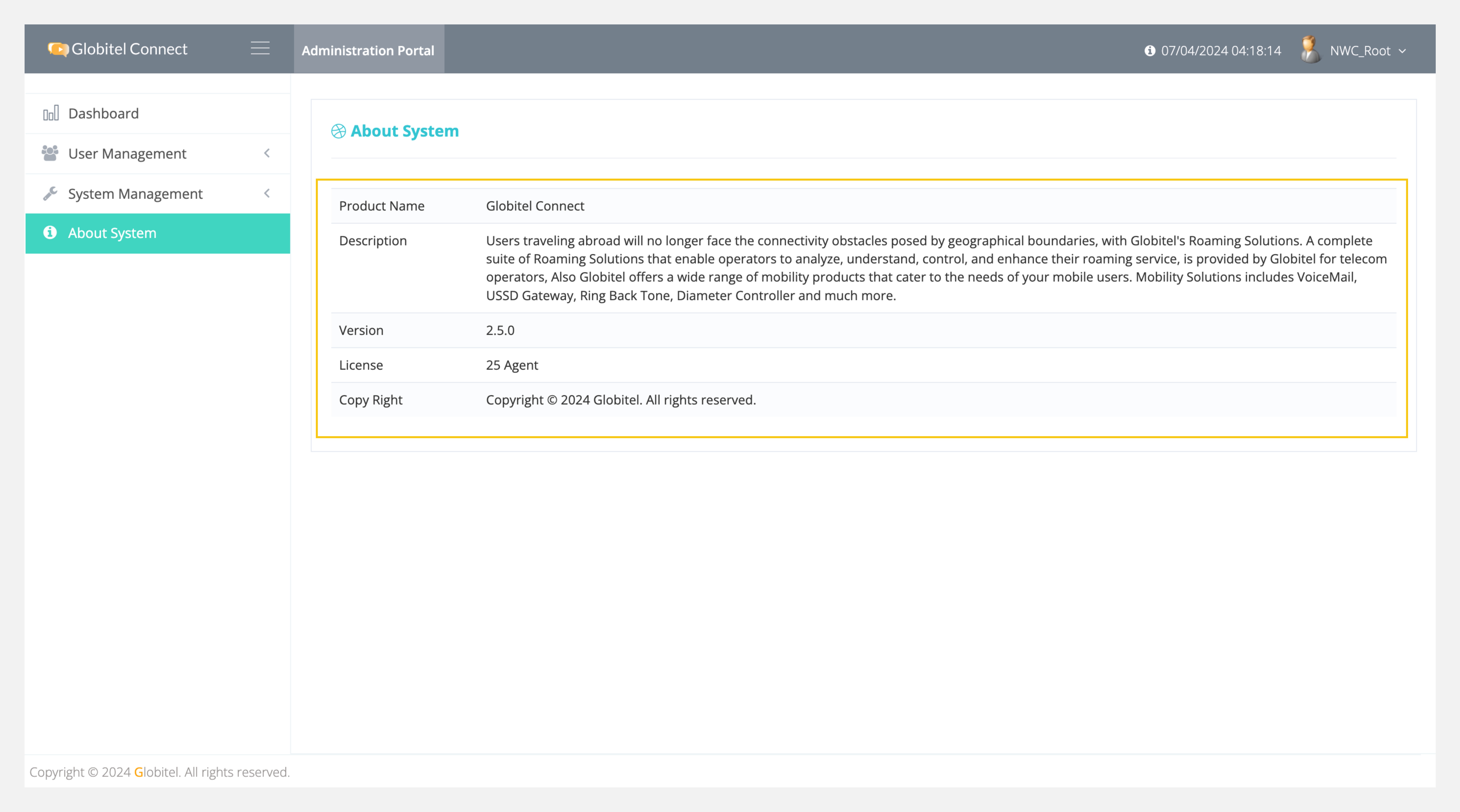 Under the About System page, you can find system information such as product name, description, current version, and license. The license information is helpful for providing the maximum number of allowed agent users on your subscription.