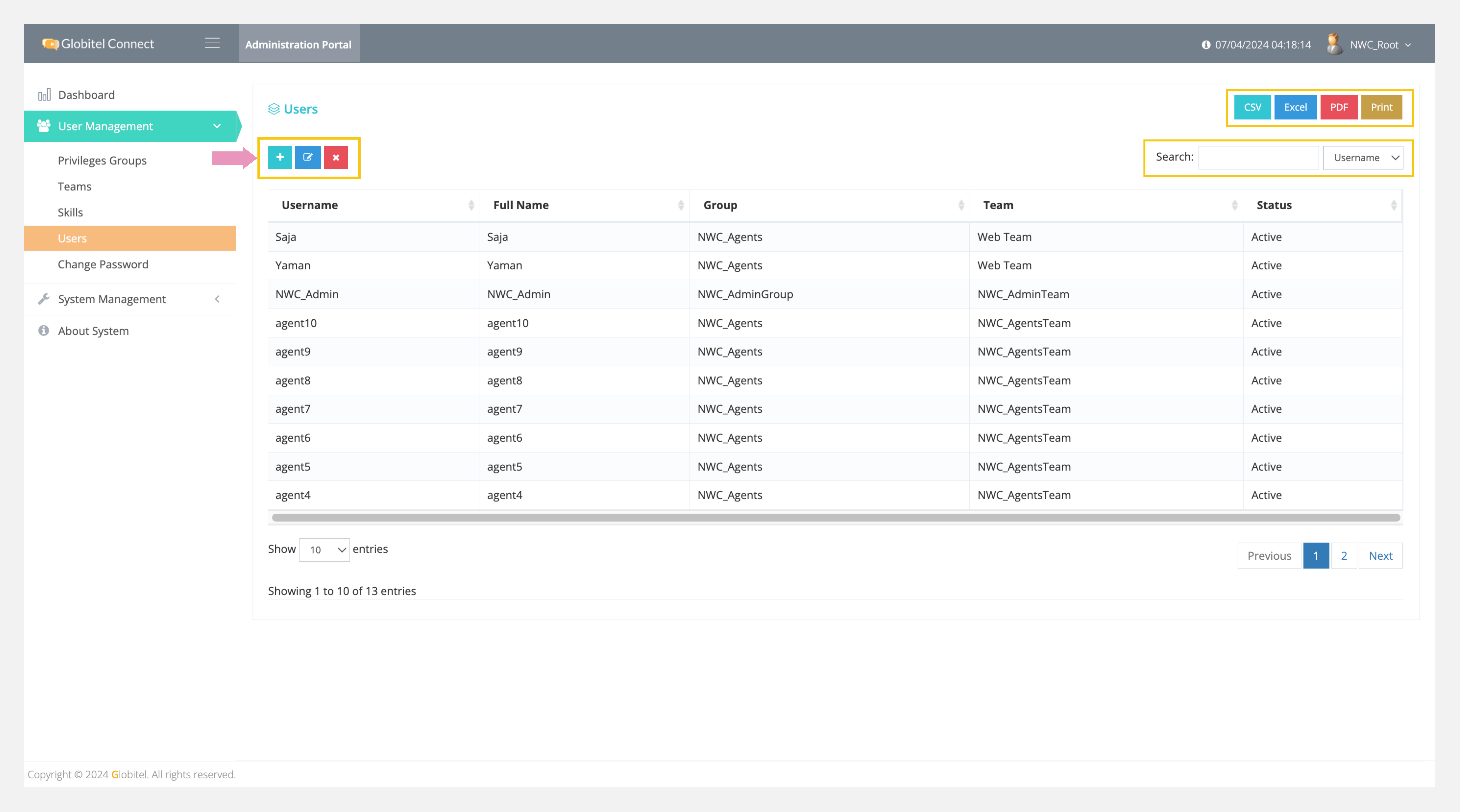 Teams management allows you to manage all users in the system by adding new users, updating selected users, and deleting selected users. It is essential to add agents, supervisors, and admins to enable them to start accessing the agent and admin portals.