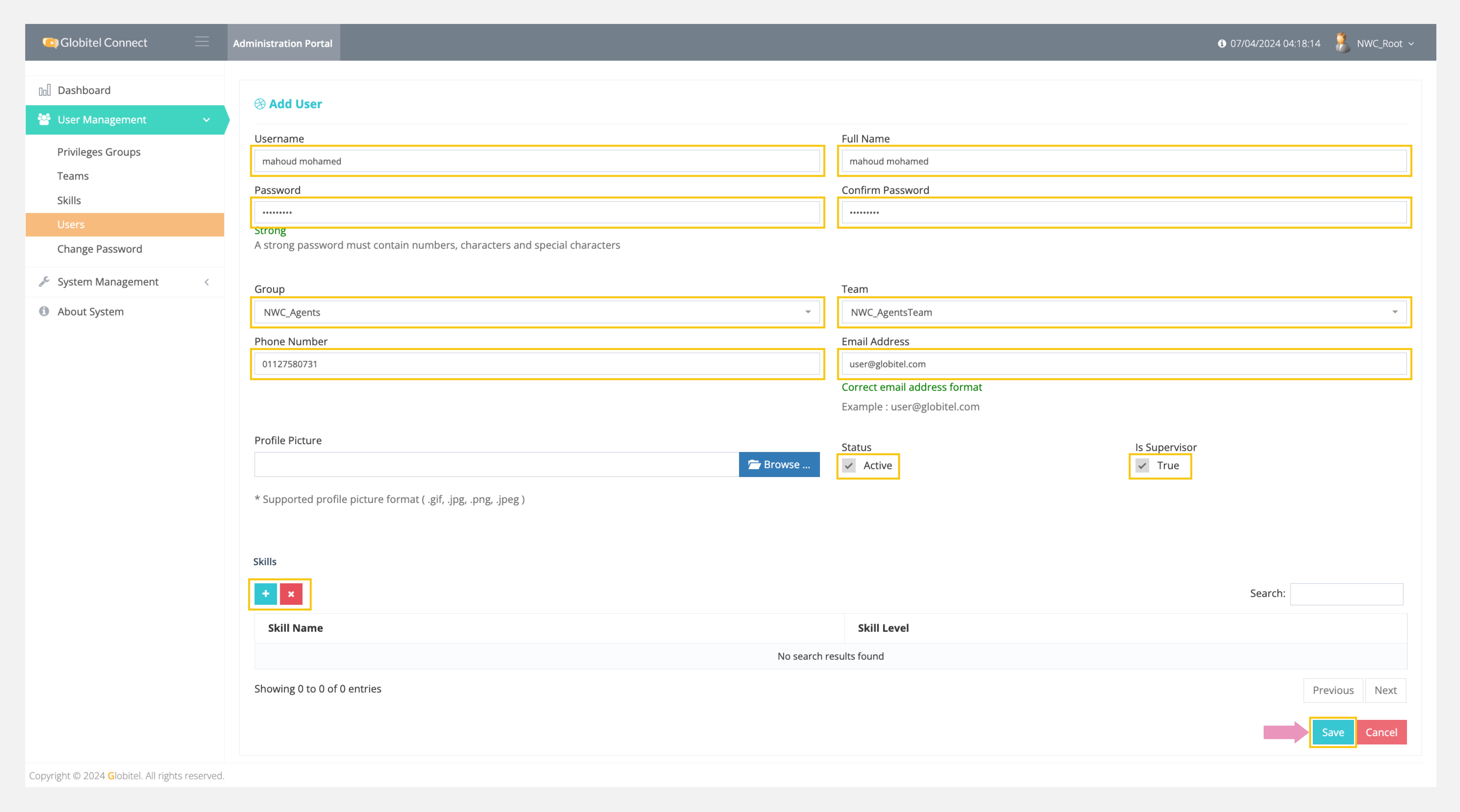 You can select skills for this user by clicking on the "+" icon under the skills section while adding a new user.
