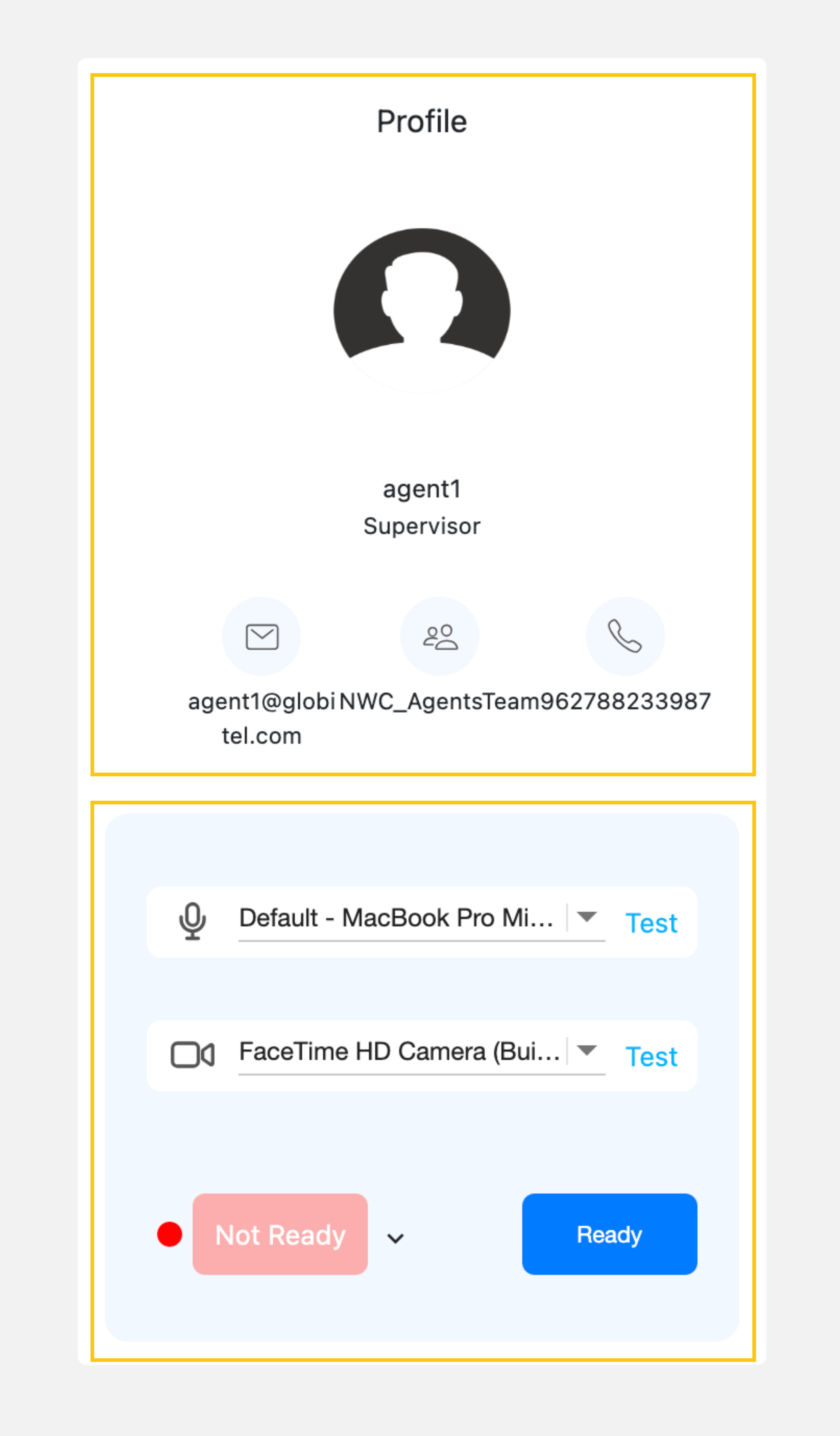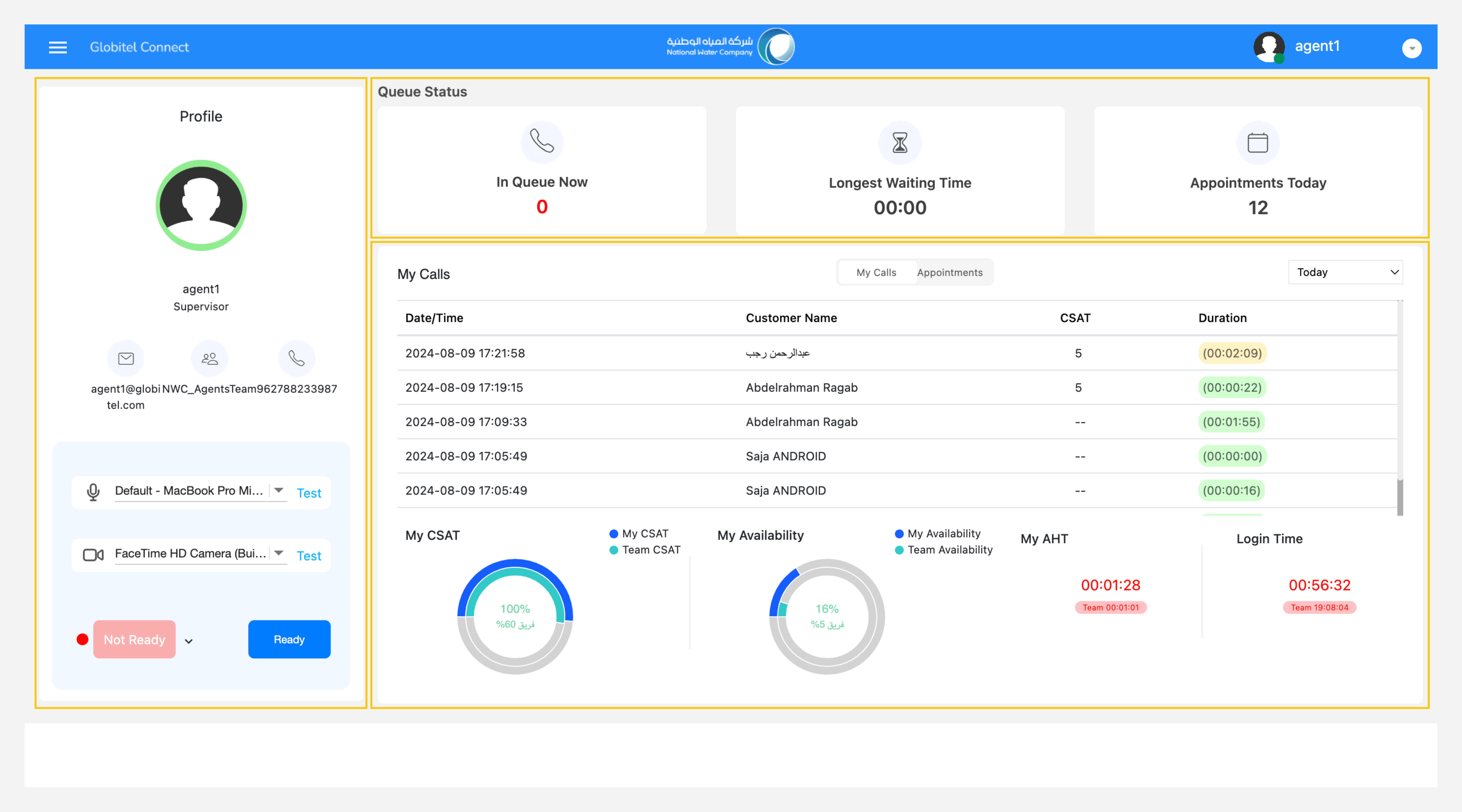 This is the first screen you will access after logging in and sharing your screen. It's a landing page that provides comprehensive details about customers interactions, your own performance, and being ready to receive new customer interactions. This is extremely useful for giving you a view of what's happening around you.